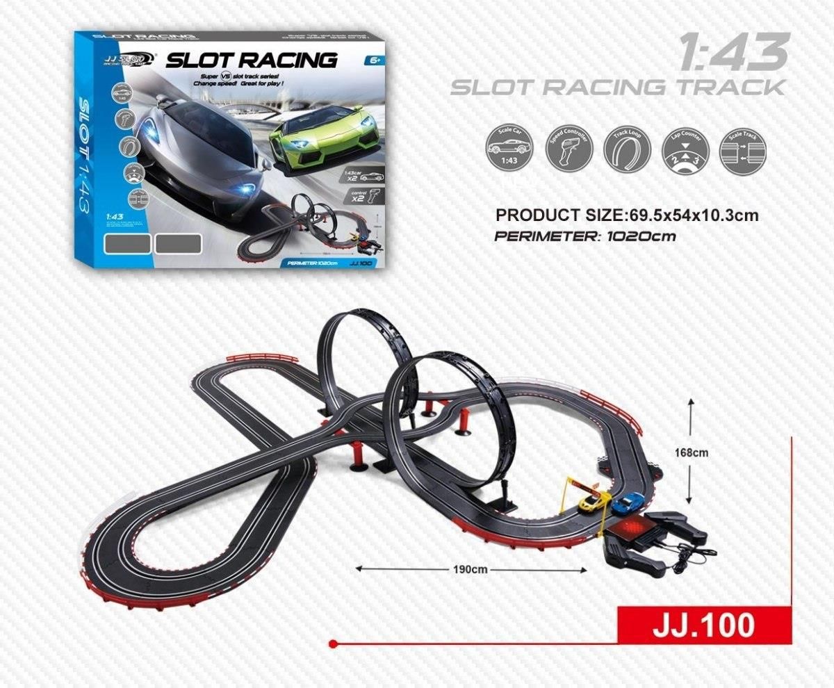 Opis Tor 2 Pętle Światła 1:43Duży tor wyścigowy z dwoma autami to gratka dla każdego amatora wyścigów samochodowych. Długość toru to aż 1020 cm, wymiary toru w stanie zmontowanym 190 cm x 168 cm, skala 1:43. Tor zasilany jest z sieci 220V, zasilacz 12V. Podczas jazdy w autkach świecą się przednie światła. Zabawa torem pozytywnie wpływa na koordynację wzrokowo-ruchową dzieci i zapewni im wiele wrażeń: Zawartość zestawu - części do montażu toru, - 2 regulatory prędkości (piloty), - zasilacz 12V, - instrukcja montażu. Wymiary - tor ok. 190 cm x 168 cm, - pilot ok. 9 cm x 4 cm, - autko ok. 4,5 cm x 10 cm, - opakowanie ok. 54 cm x 69,5 x 9 cm.