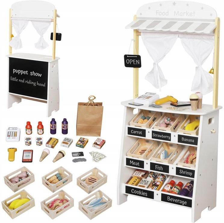 Drewniany Sklepik i Teatrzyk 2w1 idealna zabawka dla małych artystów! Ten uroczy drewniany stragan to doskonała zabawka dla dzieci, które kochają zabawy w odgrywanie ról. Wykonany z naturalnego drewna, w białym i naturalnym kolorze, które nadają mu klasyczny i estetyczny wygląd. Stragan wyposażony …