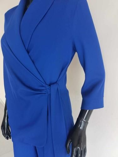 Elegancki komplet marynarka ze spodniami. Góra w formie luźnej marynarki zawiązywanej z lewej strony na szarfę . Rękaw 3/4 z delikatnym rozcięciem. Marynarka posiada wszyte poduszki dziękiczemu bardzo ładnie się układa.Spodnie z klasyczna prostą nogawką z kantką. Góra spodni z tyłu na gumeczce . …