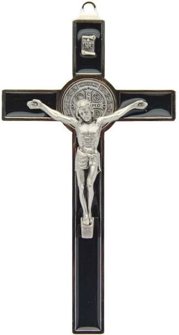Krzyż św. Benedykta, metalowy, kolor czarny. Wymiary: 12,5 cm x 7 cm