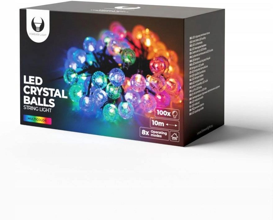 Łańcuch świetlny LED PRZEZROCZYSTE KULKI CB101 10m 100 kulek kolorowy 230V Forever Light Twórz wyjątkową atmosferę z delikatnym łańcuchem świetlnym z kolorowymi diodami LED od Forever Light Łańcuch świetlny LED PRZEZROCZYSTE KULKI CB101 to produkt, który nie tylko odporowy na uderzenia, ale także na trudne warunki zewnętrzne. Każda przezroczysta kula emituje eleganckie, kolorowe światło, co tworzy wyjątkową atmosferę, idealną na przykład na święta Bożego Narodzenia. Ozdabiaj na zewnątrz i wewnątrz Dzięki szczelności na poziomie IP20, łańcuch Forever Light może być zamontowany na zewnątrz po odpowiednim zabezpieczeniu programatora i wtyczki oraz jest także idealny do dekoracji sypialni, salonu, patio czy tarasu. Może być również użyty jako ozdoba na choince, ozdoba restauracji, dekoracja przyjęć ślubnych czy urodzinowych. 100 kulek na 10 metrów Łańcuch o długości 10 metrów ma 100 kulek równomiernie rozstawionych na całej długości. W połączeniu z programatorem, który oferuje 8 trybów pracy świateł, ten łańcuch świetlny pozwala stworzyć niemal każdy efekt. Cechy produktu: Delikatny łańcuch świetlny z kolorowymi diodami LED Odporny na uderzenia i warunki zewnętrzne Światła emitowane z przezroczystych kul Kule emitują eleganckie, kolorowe światło Może być zamontowany na zewnątrz po odpowiednim zabezpieczeniu programatora i wtyczki Może być użyty do dekoracji wnętrz i zewnątrz Łańcuch o długości 10 metrów z 100 kulkami Programator z 8 trybami pracy świateł