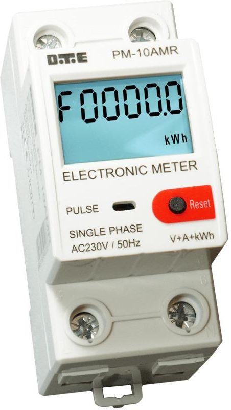 Licznik energii elektrycznej D.T.E. PM-10AMR jest przeznaczony do pomiaru zużycia energii elektrycznej w jednofazowej sieci prądu przemiennego. Funkcje: Całkowite zużycie energii elektrycznej Zużycie energii elektrycznej po zerowaniu licznika Wyświetlanie napięcia sieciowego Wyświetlanie bieżącego poboru prądu Wyświetlacz zużycia energii Wyświetlacz LCD z podświetleniem Montaż: szyna DIN 35mm Specyfikacja Funkcja resetowania Napięcie robocze - 230V Częstotliwość sieci - 50Hz Prąd znamionowy - 10A Prąd maksymalny - 60A Wymiary - 80x35x65mm