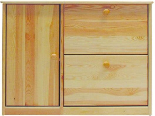 Drewniana Szafka na buty sosnowa I+II C97 Szafka na buty z drewna sosnowego to idealne rozwiązanie do każdego przedpokoju. Wykonana z naturalnego, trwałego drewna, łączy estetykę z praktycznością. Posiada dwie pojemne, uchylne szuflady, które pomogą w utrzymaniu porządku i zapewnią wygodne miejsce do przechowywania obuwia. Dodatkowo, z lewej strony znajduje się jedna szafka z drzwiczkami, która umożliwia przechowywanie innych akcesoriów, jak torby. Cechy produktu Materiał: Wysokiej jakości drewno sosnowe, które gwarantuje trwałość i stabilność. Wymiary: 90 cm szerokości, 29 cm głębokości, 80 cm wysokości - idealna do większości przedpokojów. Pojemność: Dwie uchylne szuflady na buty i dodatkowa przestrzeń w szafce z drzwiczkami. Kolory wykończenia: Dostępna w trzech wariantach kolorystycznych bejcowania: olcha, dąb, orzech - dopasuje się do różnych stylów wnętrz. Funkcjonalność: Uchylne pojemniki zapewniają łatwy dostęp do przechowywanych butów, a drzwiczki w dodatkowej szafce umożliwiają wygodne przechowywanie innych rzeczy.