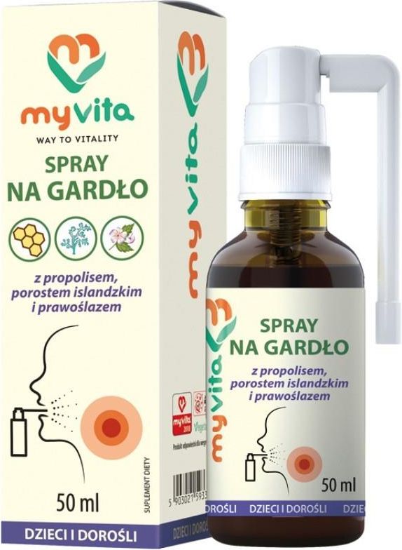Spray na gardło z propolisem, ekstraktami z prawoślazu i porostu islandzkiego - dzieci i dorośli - bez alkoholu - 50ml Suplement diety MyVita Preparat zawiera naturalne ekstrakty charakteryzujące się działaniem łagodzącym i ochronnym na podrażnioną błonę śluzową gardła, krtani i strun głosowych. …