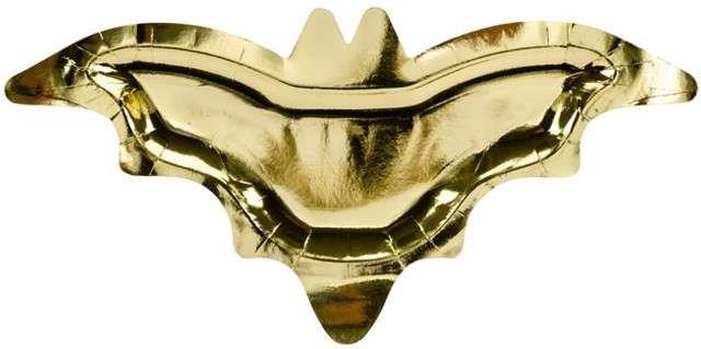 Świetne talerzyki papierowe w kształcie NIETOPERZA. Talerzyki w kolorze złotym metalicznym o wymiarach 37,5 x 18,5 cm. Świetny dodatek dekoracyjny na HALLOWEEN, lecz nie tylko talerzyki zastosowań mają wiele! Zestaw liczy 6 szt talerzyków. jednorazowy,nietoperz,papier,PartyDeco,złoty