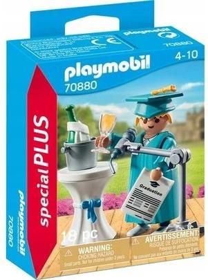 Wybierz się na Bal absolwentów w świecie Playmobil Special Plus! W miasteczku Playmobil szykuje się ważna uroczystość, na której zbiorą się wszyscy mieszkańcy. To huczny Bal absolwentów, podczas którego wszyscy wytrwali studenci odbiorą swoje dyplomy, na które tak ciężko pracowali! Dołączcie do jednego z nich i odgrywajcie odświętne scenki wspaniałych przemów i radosnego świętowania! Ten wyjątkowo dostojny zestaw Special Plus wprowadzi do zabawy nieco uroczystych tonów. Każdy 4-latek i starszy urwis może śmiało połączyć scenkę Balu absolwentów z posiadanymi już zestawami Playmobili by godzinami snuć historie o dzieciakach opuszczających rodzinne gniazdo i wytrwale uczących się, by móc zaprosić rodziców na Bal absolwentów! Rozmiar Czcionki (px): Aż 18 tematycznych zabawek do odgrywania scenek Balu absolwentów! Odbiór dyplomów to wyjątkowe wydarzenie, które wymaga odpowiedniej oprawy. Do ułożenia podniosłej scenki Balu absolwentów dzieci wykorzystają 18 akcesoriów dostępnych w zestawie Playmobil Special Plus. Wśród nich mikrofon do przemówień, elegancki stolik z niebieską wstążką oraz oczywiście odświętnie ubraną figurkę. Absolwent ma na sobie niebieską togę oraz biret studencki. Kiedy odbierze swój dyplom i stanie przed mikrofonem, musi wygłosić wspaniałą przemowę o pokonywaniu trudności i wytrwałości w dążeniu do celów. Po wszystkim czeka na niego pojemnik z szampanem oraz lampka, którą można włożyć w dłoń figurki, by rozpocząć Bal absolwentów! O serii – zestawy Playmobil Special Plus Figurek Playmobil nigdy dość! Dlatego właśnie powstała seria Playmobil Special Plus, która obfituje w fantastyczne małe zestawy z akcesoriami tematycznymi. Każdy z nich porusza inną tematykę, by wzbogacać klasyczne zestawy Playmobil o nowe wątki i pozwalać dzieciom wymyślać fantastyczne przygody. Wszystkie zestawy Playmobil Special Plus to 7,5-centymetrowa figurka oraz dodatki, które rozbudzą wyobraźnię. Każda z nich opowiada inną historię, a dopracowane detale sprawiają, że już kilka dodatkowych akcesoriów pozwoli stworzyć cała masę porywających scenariuszy! Figurki pasują do wszystkich innych zestawów Playmobil, więc dzieciaki mogą dowolnie łączyć tematykę swoich zabawek – ogranicza nas tylko wyobraźnia!
