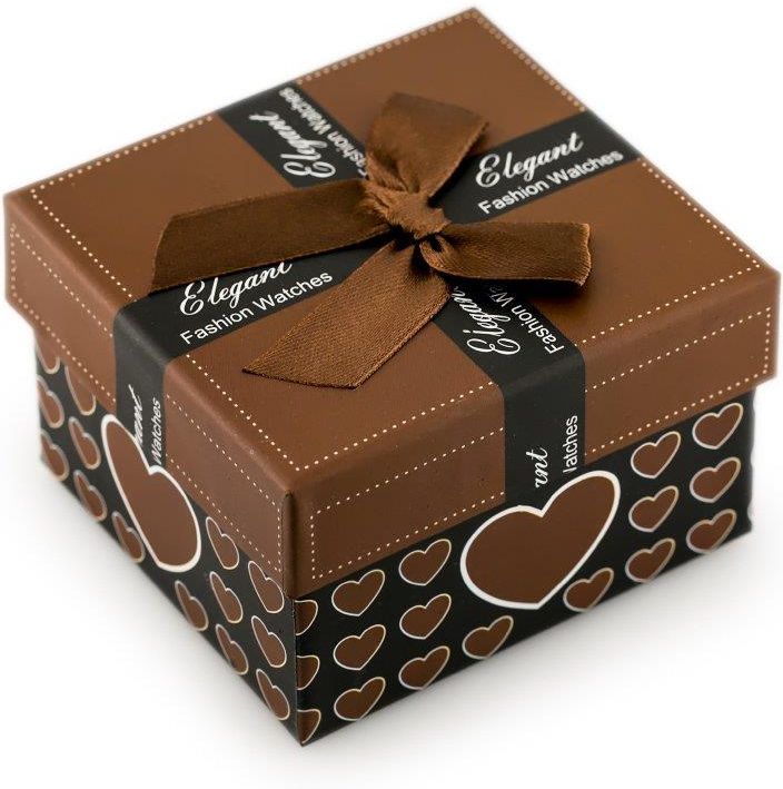Inny Prezentowe pudełko na zegarek - serduszka brązowe WYMIARY: długość: 81mm szerokość: 87mm pokrywka: 84 x 90mm wysokość: 56mm Tekturowe pudełko w serduszka w kolorze brązowo-czarnym z brązową wstążką. Na wieczku pudełka znajduje się napis: Elegant Fashion Watches. Wewnątrz poduszka w kolorze …