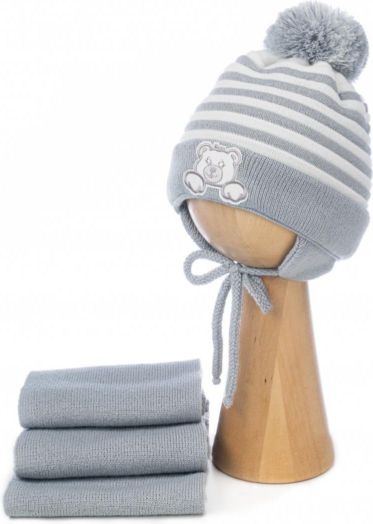 Komplecik chłopięcy, składający się z czapki i szalika został wykonany z wysokogatunkowego akrylu. Czapka ciepła, dwuwarstwowa, posiada osłonki na uszy. Komplet zawiera szaliczek w tym samym kolorze. Skład: 100% akryl Obwód głowy: 40-42 cm Rozmiar: 3–6 miesięcy