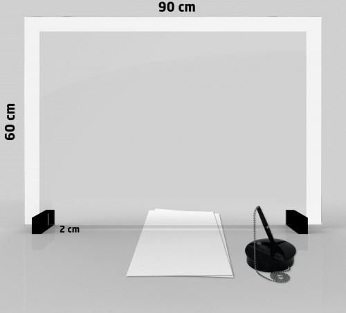 Przegroda SZKLANA Bariera Ochronna Bezpieczna Przestrzeń rozmiar 90x60 cm rama biała Szklana Bariera Ochronna 90x60 cm to wysokiej jakości, bezpieczny produkt, który pomaga przeciwdziałać rozprzestrzenianiu się bakterii i wirusów. Tablica posiada obramowanie w kolorze białym. Najważniejsze cechy szklanej bariery ochronnej: Powierzchnia osłony jest wykonana z hartowanego szkła o grubości 4mm, Na tablicy umieszczone jest obramowanie w kolorze białym Szklana tafla odporna jest na działanie środków chemicznych. Dlatego też osłonę można myć wszelkimi dostępnymi na rynku detergentami, Do dezynfekcji można stosować środki wirusobójcze, bakteriobójcze i grzybobójcze zawierające alkohole a także ich mieszaniny. SZKLANA Bariera Ochronna ALLboards jest bardzo łatwa w montażu, natychmiast gotowa do użycia, nie potrzebujesz żadnych narzędzi aby złożyć naszą przegrodę. W razie potrzeby przegrodę można łatwo zdemontować i schować aby zaoszczędzić miejsce, jej zdecydowaną zaletą jest łatwość w utrzymaniu czystości/dezynfekcji.