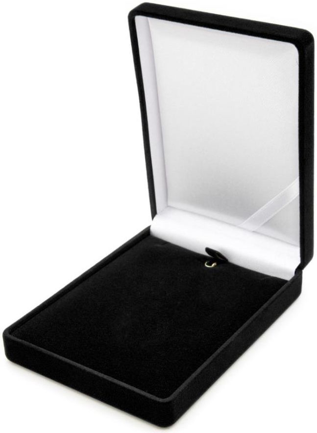 Pudełeczko jubilerskie pokryte welurową tkaniną w kolorze czarnym, środek wieczka z białej satyny. Wymiary pudełka: Długość: ok. 120 mm Szerokość: ok. 90 mm Wysokość: ok. 30 mm Brak możliwości dołączenia grawera ze względu na poduszkę przymocowaną fabrycznie w wieczku.