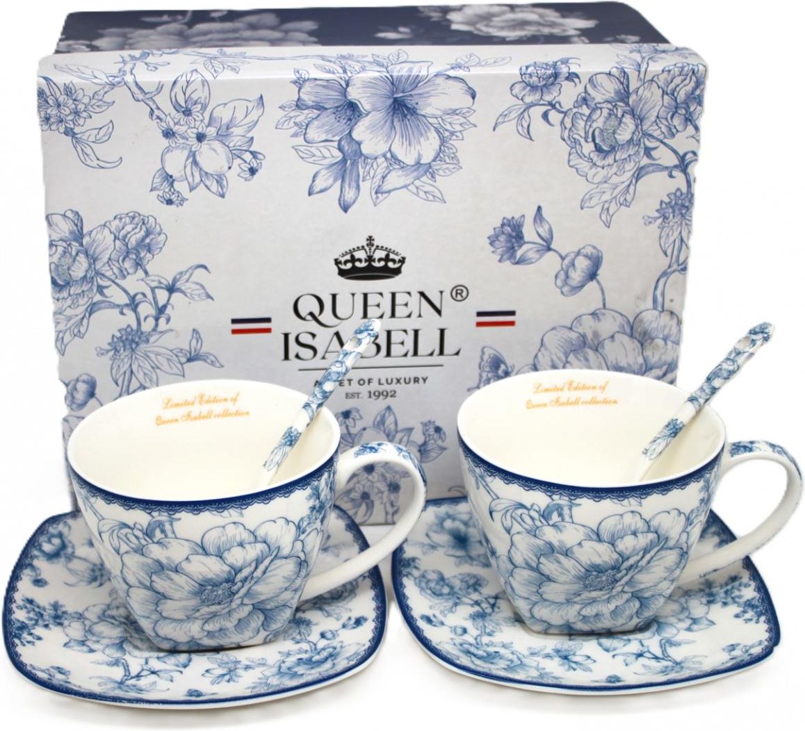Zestaw Dwóch Filiżanek Niebieskie Róże Zestaw Filiżanek Idealny na Prezent Wytworny zestaw dwóch porcelanowych filiżanek z talerzykami i łyżeczkami renomowanej marki Queen Isabell to doskonałe połączenie tradycji z nowoczesnym stylem. Każdy element tego zestawu zachwyca precyzyjnym wykonaniem oraz pięknym, klasycznym wzorem w odcieniach niebieskiego, inspirowanym motywami florystycznymi. Cechy zestawu: Filiżanki: Pojemność idealna na kawę w stylu cappucino. Wykonane z wysokiej jakości porcelany, charakteryzującej się trwałością oraz odpornością na przebarwienia. Zdobione delikatnymi motywami kwiatowymi w stylu vintage. Talerzyki: Oryginalne, kwadratowe talerzyki dopełniają elegancję zestawu i nadają mu wyjątkowy charakter. Utrzymane w tym samym wzorze co filiżanki, tworzą spójną całość. Łyżeczki: Wykonane z porcelany, ozdobione pasującymi wzorami kwiatowymi. Idealnie dopasowane rozmiarem do filiżanek, stanowiąc praktyczny i estetyczny dodatek. Ekskluzywne opakowanie: Zestaw zapakowany jest w eleganckie pudełko sygnowane logiem marki Queen Isabell. Pudełko zdobione subtelnymi, niebieskimi wzorami kwiatowymi doskonale podkreśla luksusowy charakter produktu. Idealnie nadaje się na prezent, bez potrzeby dodatkowego pakowania – wystarczy dodać kokardę! Dlaczego warto wybrać ten zestaw: Do codziennego użytku: Filiżanki sprawdzą się w domowym zaciszu, podczas porannej kawy lub popołudniowych spotkań z przyjaciółmi. Jako prezent: Luksusowy zestaw Queen Isabell to perfekcyjny wybór na każdą okazję – urodziny, rocznicę, święta czy Dzień Matki. Dekoracja: Piękne wykonanie czyni zestaw nie tylko praktycznym, ale również stylowym elementem dekoracyjnym stołu. Specyfikacja produktu: Pojemność filiżanek: 250 ml. Wysokość filiżanek: 7,5cm Wymiar podstawek: 14cm x 14cm Długość łyżeczki: 13cm Zestaw filiżanek Queen Isabell to doskonały wybór dla osób ceniących sobie piękno, jakość i wyrafinowany styl. Idealny zarówno na prezent, jak i do użytku codziennego – dodaj swojej kawie odrobinę luksusu!