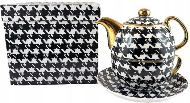 Porcelanowa filiżanka z dzbankiem "Tea for One" z serii Pepitka z kolekcji Queen Isabell. Linia zdobiona motywem czarno-białej pepitki. Stonowana kolorystyka nadaje linii klasyki i elegancji, a piękny wzór kratki na zestawie przykuje niejedno spojrzenie. Bardzo oryginalny komplet z porcelany składający się z dzbanka o pojemności 300 ml oraz filiżanki o pojemności 280 ml (pojemność liczona po rant filiżanki) z talerzykiem ozdobione motywem czarno-białej pepitki. W trakcie parzenia herbaty dzbanek można pozostawić na filiżance aby ją ogrzać, w ten sposób herbata na dłużej pozostaje ciepła. Czarno-białe tło zestawu ze złotymi akcentami prezentuje się zjawiskowo. Całość zapakowana w ozdobne pudełko dekorowane tym samym motywem to doskonały pomysł na niebanalny prezent urodzinowy, a także podarunek dla szefa czy nauczyciela, również jako podziękowanie. Wzór: pepitka Produkt 1 x filiżanka 1 x spodek 1 x dzbanek 1 x prezentowe pudełko Wymiary pojemność dzbanka 300 ml pojemność całkowita filiżanki 280 ml pojemność użytkowa filiżanki około 250 ml średnica filiżanki 10,4 cm średnica spodka 15,2 cm wysokość filiżanki 6 cm wymiary pudełka 16,2 cm x 16,2 cm x 14 cm h Materiał porcelana Użytkowanie dopuszczone do kontaktu z żywnością