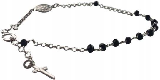 Różaniec srebrny – bransoletka z onyksami – wykonany ze srebra próby 0,925. Zawiera medalik z wizerunkiem Matki Boskiej oraz krzyżyk. Całkowita długość bransoletki: 20 cm Waga: 3,6 g Wysokość krzyżyka: 15 mm/ 8 mm Wielkość medalika:12 mm/ 8 mm Srebrny różaniec może być pamiątką chrztu, pierwszej komunii czy bierzmowania.