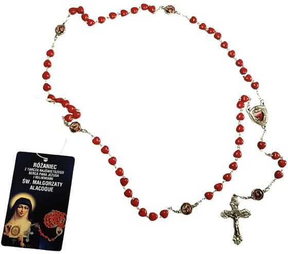 Specjalna edycja cenionego przez wiernych różańca wykonana z okazji 350-lecia objawień Najświętszego Serca Pana Jezusa św. Małgorzacie Alacoque. To tym objawieniom i tej świętej zawdzięczamy kult Najświętszego Serca, w tym choćby nabożeństwo pierwszych piątków i obietnice z nimi związane. Łącznik w różańca to Tarcza NSPJ. Kościół dwukrotnie nadał odpust za noszenie Tarczy, a liczne świadectwa wskazują, że czciciele Serca Bożego, którzy z wiarą nosili Tarczę, doznawali potężnej ochrony przed chorobami, zarazą i innymi niebezpieczeństwami. Paciorki różańca są w kształcie serduszek różańca, a łączniki w kształcie róży – pierwszy jest z relikwiami św. Małgorzaty Alacoque, kolejne mają wizerunek Jezusa i Maryi oraz ich Najświętsze Serca. Całość opatrzona jest certyfikatem autentyczności relikwii. Różaniec w wygodnym, jutowym etui. Długoś różańca: 50 cm