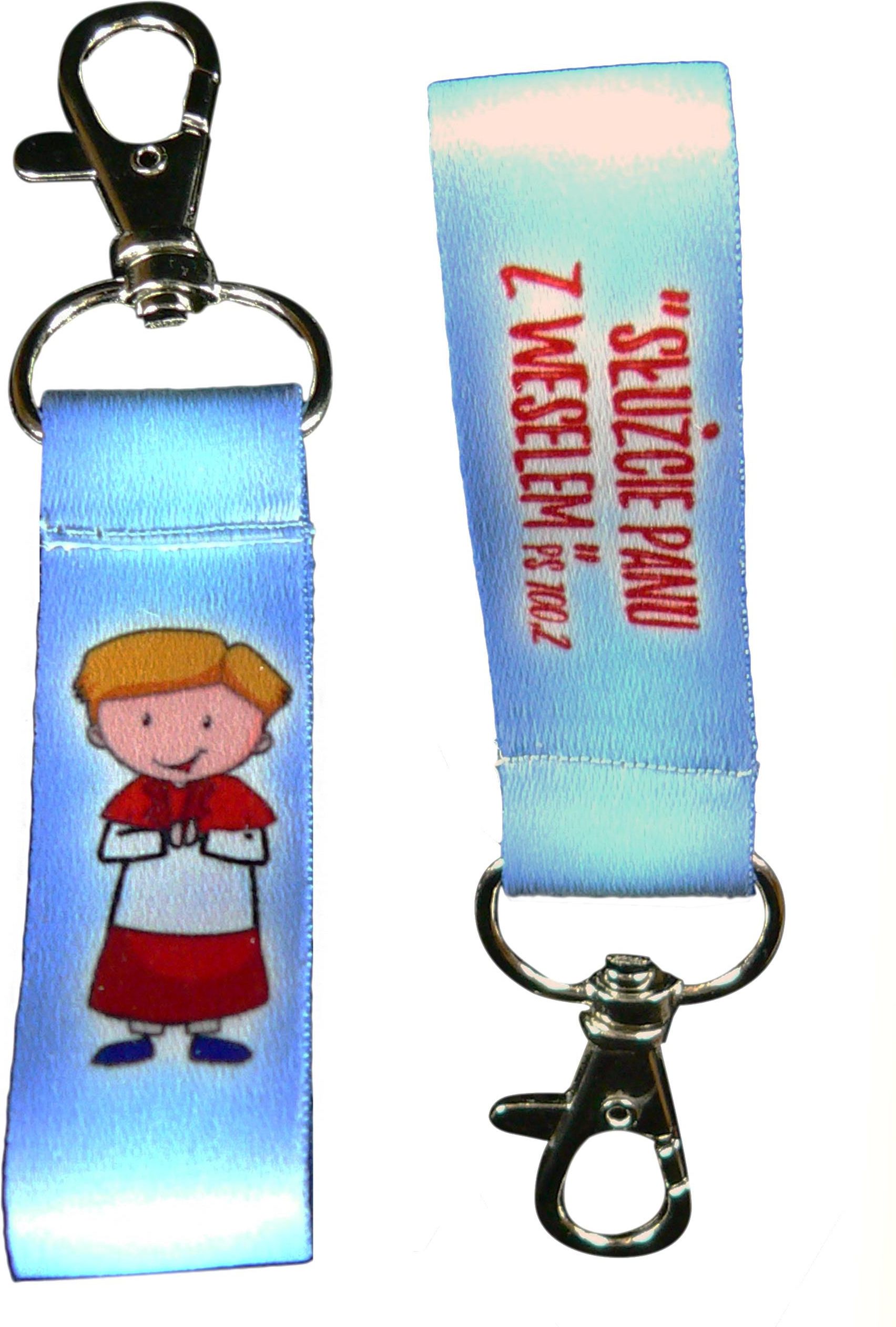 Krótka smycz z rysunkiem postaci ministranta na jednej stronie i napisem: Służcie Panu z weselem , na drugiej. Długość: 10 cm Szerokość: 2 cm Zapięcie: karabińczyk Idealnie nadaje się do kluczy lub pendrive.