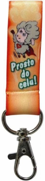 Krótka smycz z napisem: Prosto do celu. Długość: 10 cm Szerokość: 2 cm Zapięcie: karabińczyk Idealnie nadaje się do kluczy lub pendrive.
