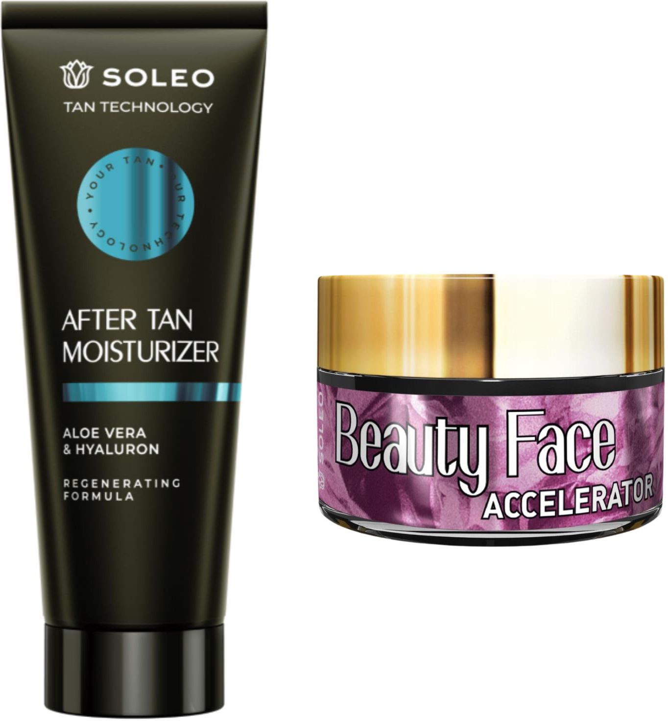 Soleo Tan Technology After Tan Moisturizer + Słoiczek Beauty FaceSoleo Tan Technology After Tan Moisturizer Balsam Po Opalaniu 200mlSoleo tan technology after tan moisturizer to ekspert w dziedzinie pielęgnacji do codziennego stosowani. Zawiera esencję najlepszych składników w zakresie wielowarstwowego nawilżenia. Zawartość aloesu przyspiesza zdolności regeneracyjne, wpływa na redukcję negatywnych skutków działania promieniowania uv. Kwas hialuronowy sprawia, że skóra pozostaje gładka i elastyczna przez długi czas. Ten regenerujący balsam do zadań specjalnych to gwarancja kompleksowej i skutecznej pielęgnacji ciała.Działanie:Przedłuża opaleniznęGłęboko i intensywnie nawilżaRegeneruje opaloną skóręSkładniki aktywne:Wyselekcjonowane składniki nawilżające i regenerujące: kwas hialuronowy, aloes, olej ze słodkich migdałów, allantoina – pomagają przywrócić skórze optymalny poziom nawilżenia i wydobywają jej wewnętrzny blask. Olej jojoba - uszczelnia warstwę cementu międzykomórkowego skóry, dzięki czemu zapobiega jej wysuszeniu oraz przyspiesza regenerację.Składniki łagodzące: pantenol, ekstrakt z zielonej herbaty, ekstraktZ aloesu – działają nawilżająco, łagodząco i przeciwzapalnie, dzięki czemu zmniejsza zaczerwienienie skóry. Kondycjonują i regeneruje skórę.Składnik o działaniu przeciwzapalnym i antyoksydacyjnym: witamina e, ekstrakt z korzenia lukrecji gładkiej, ekstrakt z nagietka lekarskiego – działanie przeciwutleniaczy polega na hamowaniu działania wolnych rodników, czyli niedopuszczaniu do powstawania reakcji utleniania w organizmie. Dzięki temu można zapobiec przedwczesnemu starzeniu się skóry.Zapach: cotton flowerPojemność: 200 mlSoleo Beauty Face Accelerator PrzyspieszaczBeauty face accelerator intensywnie nawilżający przyspieszacz opalania twarzy, szyi i dekoltu z kolagenem. Mix składników przeciwstarzeniowych i łagodzących sprawia, że skóra wygląda promiennie i młodo.Beauty face stymuluje naturalny proces melanogenezy i przedłuża trwałość opalenizny. Szybko się wchłania, pozostawia elastyczną, nawilżoną i piękną skórę.Zapach: pink flowersPojemność: 15 mlSkładnikiTyrozyna – przyspiesza opalanieAloes & ekstrakt z rumianku – intensywnie nawilżają i działają łagodzącoKolagen regeneruje i uelastycznia skórę, działa przeciwstarzeniowoSposób użycia: Nanieś równomierną warstwę przyspieszacza na powierzchnię twarzy i dekoltu bezpośrednio przed sesją w solarium. Po aplikacji, umyj dokładnie ręce! Pamiętaj, że produkt przeznaczony jest wyłącznie do użytku zewnętrznego. Stosuj każdorazowo przed wizytą w solarium.Dla vegan, wolny od parabenów.Produkt nie testowany na zwierzętach.