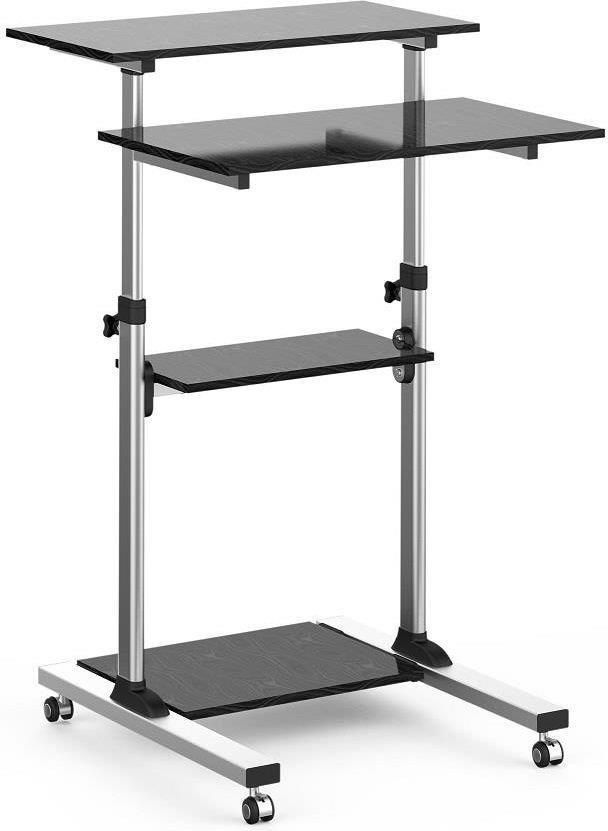 Uniwersalne mobilne biurko / Stolik prezentacyjnyInformacje dodatkoweElementy montażowe, Idealne również jako mobilny stolik prezentacyjny do projektora lub, Instrukcja użytkownika, Kolor: czarny, Opis produktu:, Parametry techniczne:, Podstawa na kółkach (2 z blokadą), Podstawa wyposażona w 4 kółka (2 z blokadą) ułatwiające przemieszczanie, Połka na notebook/projektor: 700x355 mm, Półka na akcesoria (1): 472x230 mm, Półka na akcesoria (2): 455x350 mm, Półka na klawiaturę: 700x400 mm, Regulacja wysokości: 938 – 1378 mm, Solidna stalowa rama malowana proszkowo, Stalowa rama, Umożliwia stworzenie stojącego lub siedzącego stanowiska pracy dzięki, Uniwersalne mobilne biurko, stolik prezentacyjny, Uniwersalne, ergonomiczne oraz mobilne biurko do notebooka, Waga: 22,032 kg, Wyposażony łącznie w cztery półki, dwie górne z regulacją wysokości, Zawartość opakowania:, notebooka, regulacji wysokości