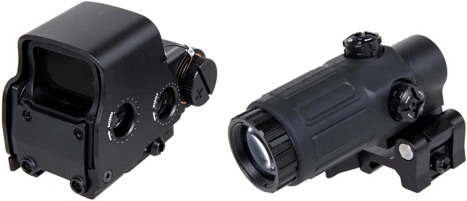 Zestaw celownika kolimatorowego z powiększalnikiem przeznaczony do montażu na szynach RIS 22 mm. Powiększalnik został zamontowany na uchylnym montażu, co umożliwia jednoczesne korzystanie z obu elementów, jak i tylko z samego kolimatora.