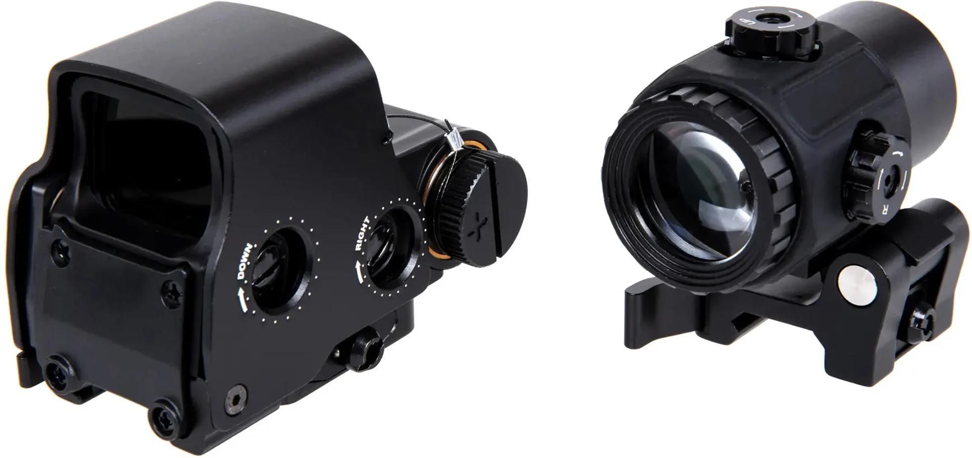 Zestaw celownika kolimatorowego z powiększalnikiem przeznaczony do montażu na szynach RIS 22 mm. Powiększalnik został zamontowany na uchylnym montażu, co umożliwia jednoczesne korzystanie z obu elementów, jak i tylko z samego kolimatora.