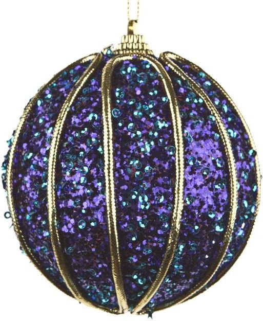 Urocza, granatowa bombka z mini cekinami w złote prążki. Pięknie się prezentuje i znakomicie połyskuje w świetle choinkowych lampek. Cena dotyczy kompletu 2 szt.