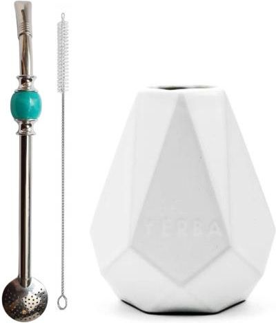 Matero Yerba Mate DIAMENT (białe) 280ml + Bombilla z Czyścikiem Zestaw zawiera: Matero szkliwione w kształcie diamentu (białe) 280ml Bombilla z kamieniem chłodzącym 21cm - niebieska Matero ceramiczne Diament 280ml białe Duże naczynko w kolorze białym do picia każdego gatunku yerba mate. Matero ceramiczne Diament wykonane jest z ceramiki, dzięki czemu jest niezwykle łatwe w czyszczeniu i utrzymaniu w czystości. Dzięki dużej pojemności(280 ml) może stać się przedmiotem zainteresowania wielu miłośników yerba mate. Mimo sporej pojemności z łatwością zmieści się w dłoni. Matero Diament zgodnie ze swoją nazwą przypomina diament, dzięki czemu prezentuje się niezwykle osobliwie i nietuzinkowo. Wyróżnia się wyglądem spośród innych naczynek do picia yerba mate dostępnych na polskim rynku. Pojemność - ok. 280 ml Tworzywo - ceramika Kolor - białe Kraj pochodzenia:Polska Bombilla z kamieniem - niebieska Bombilla do brazylijskiej yerba mate (chimarrao), przy ustniku znajduje się kolorowy pierścień chłodzący. Jest zakończona dobrze filtrującym sitkiem, który idealnie nadaje się do pylastych yerba mate. Posiada części rozkręcane. Stal nierdzewna zapewnia trwałość i odporność na uszkodzenia mechaniczne i wysokie temperatury. Prosty design nadaje elegancji i funkcjonalności. Zaletą jest dołączony wycior, który pozwoli utrzymać bombillę w czystości. kolor kamienia: niebieski długość: 21 cm