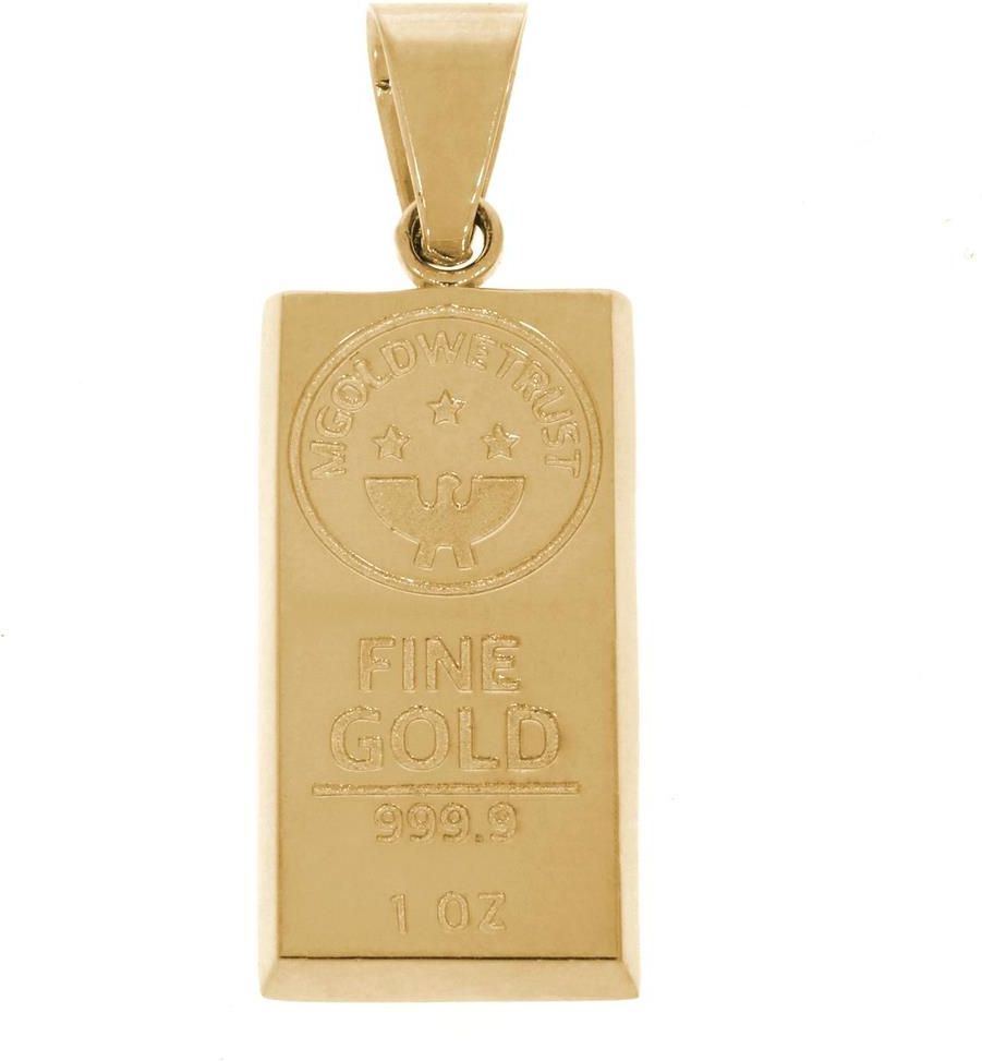Złota przywieszka wykonana ze złota próby 585 (14 k) Duży wisiorek przedstawiający sztabkę złota. Wysokość z zawieszką: ok. 48 mm Wysokość bez zawieszki: ok. 38 mm Szerokość: ok. 17 mm Waga: ok. 8,1-8,3 g Wagi i wymiary podane wyżej mogą się nieznacznie różnić w zależności od partii produkcyjnej. Każdy produkt zakupiony u nas opatrzony jest metką jubilerską wysokiej jakości. Wszystkie nasze produkty wykonane są z najwyżej jakości złota próby 585 (14k). Potwierdzeniem jest metka oraz nabity imiennik lub cecha probiercza (cecha dla produktów powyżej 1 g zgodnie z ustawą o prawie probierczym). Możesz dokupić opakowanie ozdobne, a nawet pudełko z grawerem.
