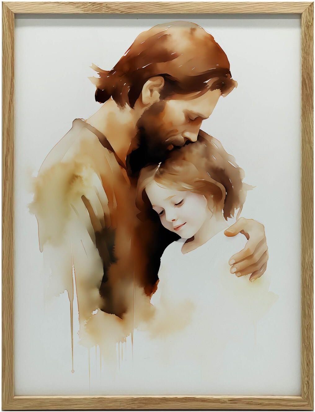 Prezentowany plakat przedstawia Jezusa, który przytula małego chłopca, wykonany w subtelnej technice akwareli. Delikatne efekty świetlne i cieniowe nadają mu realistyczny wygląd, a paleta kolorów w odcieniach bieli i brązu wprowadza atmosferę spokoju i ciepła. Prosta forma rysunku sprawia, że plakat emanuje dziecięcym urokiem, co czyni go doskonałą dekoracją do pokoju dziecięcego. Jest to również wspaniały prezent dla dziecka, szczególnie jako pamiątka z okazji Pierwszej Komunii Świętej, symbolizujący troskę i opiekę. Plakat wydrukowany jest na matowym papierze o gramaturze 230gsm i dostępny w różnych ramach, co pozwala na idealne dopasowanie do każdego wnętrza. Stanowi piękną ozdobę, która wnosi duchową głębię i estetykę do pomieszczenia.