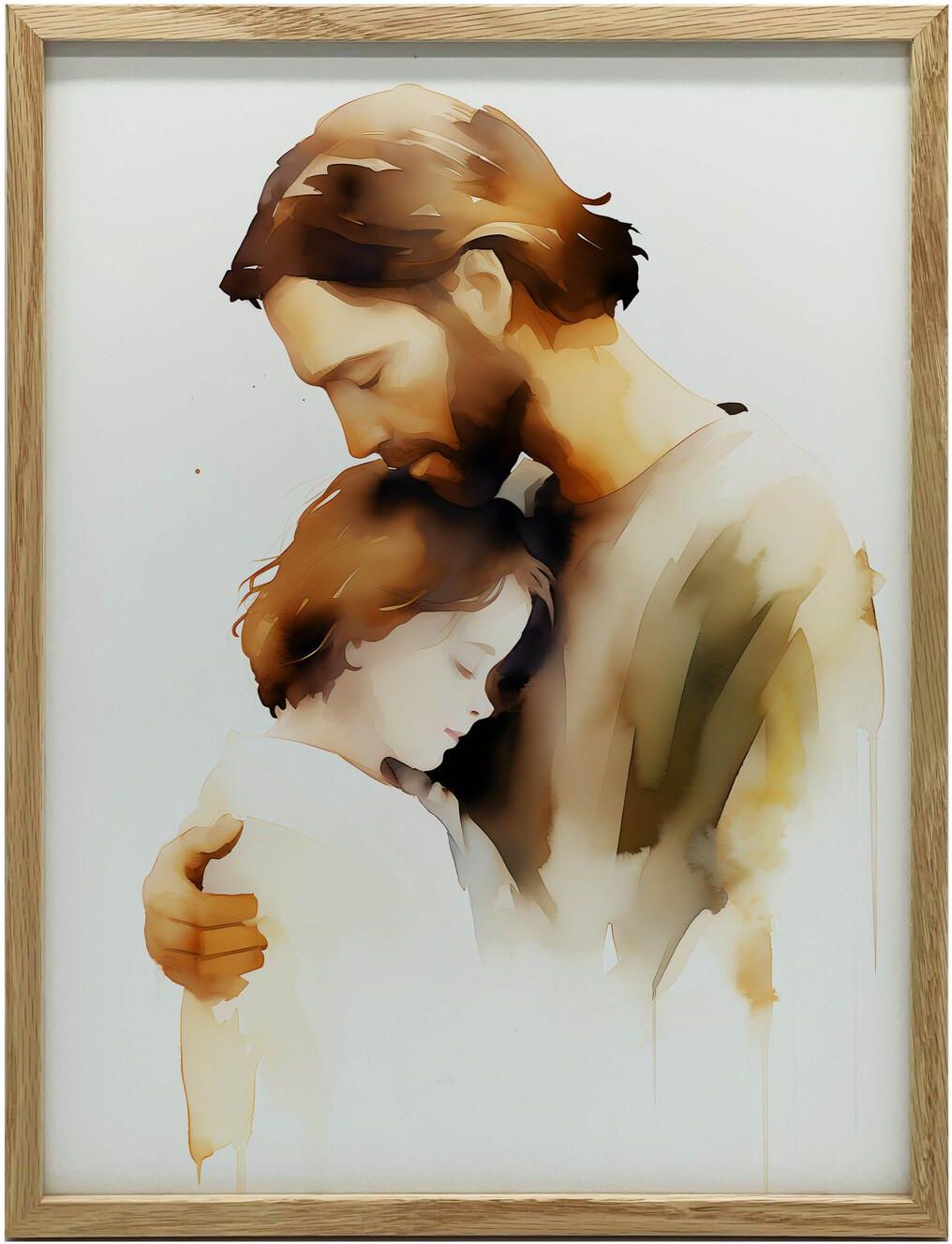 "Miłość Boska - Jezus przytulający chłopca" to poruszający plakat, który przedstawia Jezusa obejmującego małego chłopca. Obraz, stworzony w technice akwareli, zachwyca delikatnością i subtelnością użytych barw. Jasne odcienie bieli i brązu tworzą ciepłą, przytulną atmosferę, a starannie uchwycone światło i cień dodają mu realistycznego wymiaru. Prosta forma rysunku oraz dziecięcy urok sprawiają, że plakat doskonale wpisuje się w aranżację pokoju dziecięcego, wprowadzając poczucie bezpieczeństwa i miłości. To także wspaniały prezent, który może być zarówno ozdobą, jak i źródłem inspiracji dla malucha.