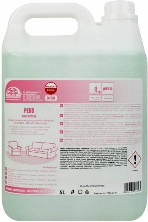 Zestaw 2x Dolphin PERS 5L – Profesjonalny środek do ekstrakcyjnego prania dywanów i tapicerki Dolphin PERS to wydajny koncentrat przeznaczony do ekstrakcyjnego prania dywanów, wykładzin i tapicerki tekstylnej. Skutecznie usuwa zabrudzenia, odświeża tkaniny i pozostawia przyjemny efekt czystości. Skutecznie rozpuszcza i usuwa tłuste osady, kurz oraz przebarwienia, nie niszcząc włókien. Skutecznie usuwa Zabrudzenia organiczne i nieorganiczne Ślady po tłuszczach i kosmetykach Kurz i alergeny Plamy po napojach i jedzeniu Po użyciu tkaniny zyskują świeży zapach oraz czysty, odświeżony wygląd. Idealny do czyszczenia Wykładzin i dywanów w biurach i hotelach Tapicerki meblowej Tapicerki samochodowej (tekstylnej) Materacy i tekstyliów użytkowych Zastosowanie Firmy sprzątające Pralnie chemiczne Hotele, pensjonaty, apartamenty Domy prywatne i mieszkania Najważniejsze cechy Profesjonalna jakość – skuteczne czyszczenie i odświeżanie Pojemność 5L – koncentrat wystarcza na wiele cykli prania Wysoka wydajność – rozcieńczanie 200–500 ml / 10 l wody Delikatny dla tkanin – nie niszczy i nie odbarwia materiałów Świeży zapach – przyjemny efekt po zakończeniu czyszczenia Bezpieczny w użyciu – produkt przebadany dermatologicznie Skala pH w skrócie (0–6) Kwaśne- Usuwanie kamienia, osadów z wody, rdzy łazienki, toalety (Sani Clean, Sani Power, Dry Acid) (7) Neutralne- Codzienne mycie delikatnych powierzchni (np. meble, szkło) (Crystal Nano, Universal Clean) (8–14) Zasadowe (alkaliczne)- Osady Mydlane, Tłuszcze, mocne zabrudzenia(łazienki, kuchnie, warsztaty, przemysł) (Sani Max, Oil Cleaner, Strong Cleaner) Dolphin PERS posiada pH zasadowe – 8,5, co idealnie wspiera usuwanie zabrudzeń organicznych bez uszkadzania włókien. Najczęściej zadawane pytania 1. Czy można go stosować w odkurzaczach piorących? Tak, jest przeznaczony do odkurzaczy ekstrakcyjnych. 2. Czy nadaje się do tapicerki samochodowej? Tak, doskonale sprawdza się w praniu tekstyliów w autach. 3. Czy usuwa tłuste zabrudzenia? Tak, skutecznie radzi sobie z zabrudzeniami po tłuszczach i olejach. 4. Czy nadaje się do delikatnych materiałów? Tak, przy zachowaniu właściwego stężenia jest bezpieczny dla większości tkanin. 5. Czy dostępny jest mniejszy wariant opakowania? Tak, produkt jest również dostępny w butelce 1L.
