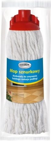 Mop sznurowy do zapinki, bardzo duży, waga 0,5 kg, biały, wykonany z bawełny.