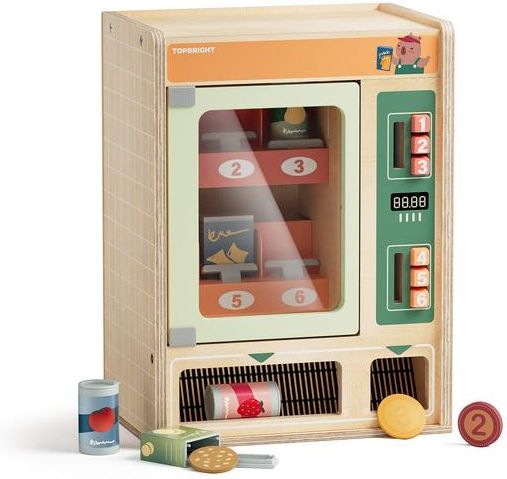 TopBright Zabawkowy automat sprzedający Shop&Go Pozwól swojemu dziecku poczuć się jak właściciel maszyny sprzedającej! Ta zabawka nie tylko bawi, ale również uczy. Dzięki realistycznemu automatowi dziecko rozwinie umiejętności liczenia, sortowania i rozumienia podstawowych mechanizmów, jednocześnie ćwicząc swoje zdolności motoryczne. Zalety zabawki Edukacja matematyczna i logiczna –zabawa z maszyną sprzedającą pozwala dziecku na naukę liczenia, sortowania i przypisywania numerów do produktów. Dziecko uczy się matematycznych podstaw, takich jak rozróżnianie liczb i kształtów, oraz podstawowych zależności między liczbą pieniędzy a wydawanymi produktami. Rozwój umiejętności motorycznych – manipulowanie monetami i przyciskami maszyny rozwija zdolności motoryczne dziecka, takie jak precyzyjne chwytanie, wkładanie monet do otworu i naciskanie przycisku. Tego rodzaju aktywności wspomagają rozwój małej motoryki i koordynacji ręka-oko. Realistyczna zabawa bez elektroniki – maszyna działa w pełni manualnie, bez potrzeby używania baterii. Dzięki temu zabawa jest prostsza i bardziej naturalna, co pozwala dziecku na pełną interakcję z zabawką i rozwój zdolności logicznych bez wpływu technologii. Stymulowanie wyobraźni i kreatywności – zabawka daje dziecku swobodę w tworzeniu różnych scenariuszy zabawy. Może ono samodzielnie wybrać, który produkt chce, jaką monetę użyć. Wzmacnianie umiejętności społecznych – zabawka sprzyja zabawie w towarzystwie. Dziecko może zapraszać innych do wspólnej zabawy, co sprzyja rozwojowi umiejętności interpersonalnych i pracy zespołowej. Wspólne zabawy uczą dzielenia się, czekania na swoją kolej oraz komunikacji. Rozwój zdolności organizacyjnych – dziecko uczy się, jak rozróżniać przedmioty w zależności od rozmiaru, kształtu i numeru. Pomaga to w kategoryzowaniu rzeczy i uczy podstaw organizacji. Zawartość zestawu zabawkowa maszyna sprzedająca napoje do zabawy przekąski do zabawy (np. precelki, ciasteczka) pieniądze do zabawy Parametry techniczne wymiary: 232 × 154 × 306 mm waga: 1,54 kg materiały: drewno lipowe, sklejka, ABS, MDF wiek dziecka: 36 miesięcy+ Ostrzeżenia(!): Produkt nieodpowiedni dla dzieci poniżej 36 miesięcy. Zawiera małe elementy – ryzyko zadławienia. Zabawka powinna być używana wyłącznie pod nadzorem osoby dorosłej. Przed podaniem dziecku należy usunąć elementy opakowania. Prosimy o zachowanie danych kontaktowych producenta na wypadek pytań. Kolory, wzory i detale techniczne mogą się różnić.