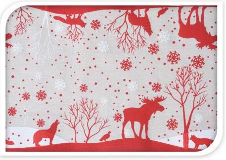Bieżnik obrus tkanina dekoracyjna 250 cm czerwono-biała z nadrukiem świątecznym Wzór:1 Ozdobna organza świąteczna nadaje się do dekoracji świątecznego stołu, do ozdabiania wieńców adwentowych i innych ozdób.. Kolor: czerwono-biały z nadrukiem. Bieżnik uzupełni świąteczną oprawę stołu i będzie wdzięcznym akcentem nadchodzącej uroczystości. Ten estetyczny dodatek może zamienić każdy posiłek w małą uroczystość. Obrus ten można połączyć z naczyniami i serwetkami w kontrastowym kolorze lub rozłożyć na zwykłym obrusie. Specyfikacja: Skład materiału: 60 % poliester, 40 % bawełna Wymiary: 25 x 28 cm Kolor:czerwono białym Wzór:1 Obrus ze wzorem wilka i renifera