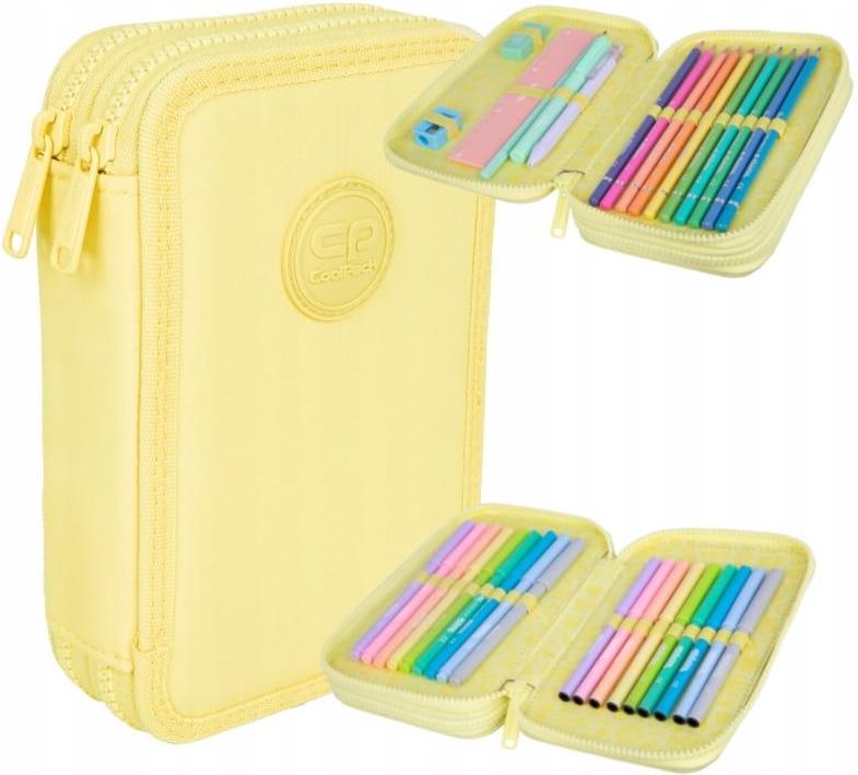 {desc/50/} CoolPack Piórnik z klapką Jumper 2 Wzór: Pastel Powder Yellow Wymiary: 19,5 x 12,5 x 5 cm Materiał: Poliester Wyposażenie piórnika jest marki Colorino. {desc/50/} {desc/50/} {desc/50/} Piórnik do zadań specjalnych! Przedstawiamy świetny piórnik z serii Jumper 2 marki CoolPack, który sprosta nawet najbardziej wygórowanym oczekiwaniom zarówno dzieci, jak i rodziców. Piórnik jest dwukomorowy i posiada pełne wyposażenie, niezbędne w każdej szkolnej sytuacji - od kredek począwszy, na linijce skończywszy. Każda przegródka piórnika zamykana jest na solidny zamek. Boki piórnika są twarde, dzięki czemu jest długotrwały, a jego zawartość jest bezpieczna. Piórnik wykonany jest w przyjemnym dla oka, pięknym, pastelowym, żółtym kolorze. {desc/50/} Stylowy niezbędnik W piórniku znajduje się pełne wyposażenie: 12 kredek ołówkowych, 18 flamastrów, ołówek, długopis, linijka, gumka, temperówka, {desc/50/}