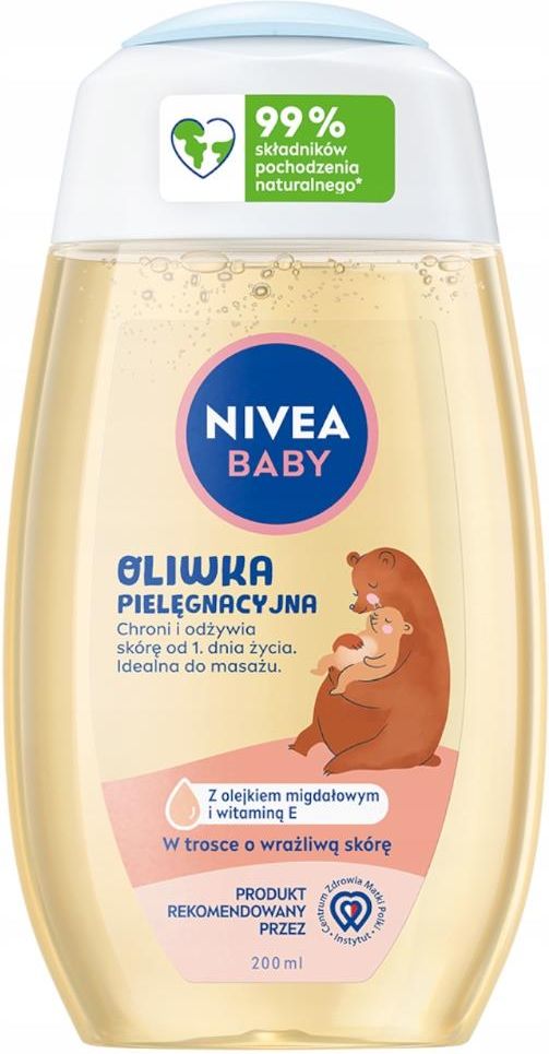 NIVEA BABY Oliwka Pielęgnacyjna 200 ml Odkryj nowość od NIVEA BABY Oliwka Pielęgnacyjna, która nie tylko odżywia, ale także pomaga chronić i wzmacnia skórę dziecka, wspierając jej naturalny proces rozwoju od 1. dnia życia. Idealna do masażu. Zawiera w 100% naturalny olejek migdałowy i witaminę E. Produkt rekomendowany przez Instytut Centrum Zdrowia Matki Polki, a jego tolerancja dla delikatnej i wrażliwej skóry niemowląt i dzieci została potwierdzona dermatologicznie. Nasze nowe formuły są łagodne i dbają o delikatną skórę dziecka i naszą planetę. Formuła jest wegańska, biodegradowalna^ i nie zawiera mikroplastiku^^. ^formuła bez składników pochodzenia zwierzęcego, biodegradowalna w 99,8% ^^zgodnie z definicją UNEP Najważniejsze cechy produktu: Od 1. dnia życia Chroni i odżywia skórę. Idealna do masażu Zawiera w 100% naturalny olejek migdałowy i witaminę E Tolerancja dla delikatnej i wrażliwej skóry niemowląt i dzieci potwierdzona dermatologicznie Produkt rekomendowany przez Instytut Centrum Zdrowia Matki Polki Skład: Glycine Soja Oil, Helianthus Annuus Seed Oil, Prunus Amygdalus Dulcis Oil, Ricinus Communis Seed Oil, Pentaerythrityl Tetra-di-t-butyl Hydroxyhydrocinnamate, Tocopherol, Propyl Gallate, Citric Acid, Parfum
