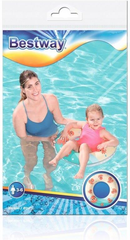 BESTWAY KOŁO DMUCHANE DO PŁYWANIA 61cm 36014 O Kółko koło dmuchane do pływania 61 cm 3-6 lat 36014Kółko do pływania firmy Bestway, to artykuł plażowy z tworzywa PCV, idealna propozycja dla ludzi lubiących wygodę i relaks. Wymiary po napompowaniu: 57 x 57 cm, Wymiary przed napompowaniem:61 x 61 cm, Wiek: 3-6 lat Wykonany z PCV o grubości: 0,21 mm Waga: 0,3 kg Prezentowane koło to produkt plażowy, który idealnie nadaje się do pływania oraz opalania na otwartych zbiornikach wodnych oraz w basenie ogrodowym. Koło jest małe i poręczne, dzięki czemu można swobodnie zabierać je ze sobą wszędzie. Koło zapakowane w ładne, podręczne foliowe opakowanie. Kółko posiada zawór, który uniemożliwia przypadkowe spuszczenie powietrza. Ostrzeżenie: Do używania jedynie w wodzie, na głębokości, na której dziecko wyczuwa dno pod nogami, oraz pod nadzorem osoby dorosłej. Wymiary podane przez producenta na opakowaniu są to wymiary maksymalnie możliwe do uzyskania w zależności od temperatury, wilgotności i ciśnienia.