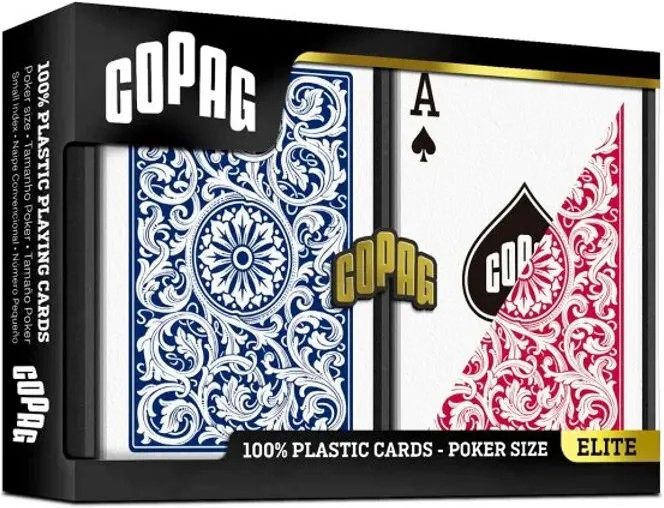 Dwa komplety kart do gry w rozmiarze pokerowym Copag Jumbo Index 100% plastikowych (jeden czerwony i jeden niebieski). COPAG to jedna z najpopularniejszych marek kart do pokera na świecie. COPAG obchodził swoje stulecie w 2008 roku. Te karty są odporne na normalne zużycie i wytrzymują dłużej niż karty papierowe, nawet do 500 razy. Wiek: 15+Producent/osoba odpowiedzialna za bezpieczeństwo produktuCartamundi Cards Poland Sp. z o.o.Ul. Półłanki 1830-740 KrakówInfo@cartamundi.com12 296 21 70
