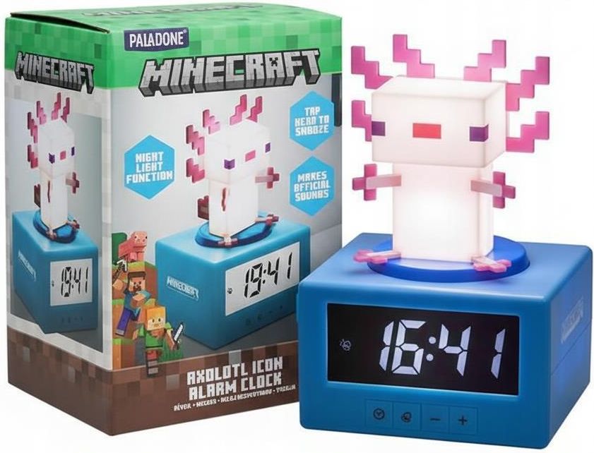 Minecraft Axolotl Icon Alarm Clock (Paladone) stan: nowy marka: Paladone model/wersja: Minecraft Axolotl Icon Alarm Clock (15043MC) kolor/wykończenie: różowy / pastel (Axolotl) zasilanie/akumulator: 3×AA (brak w zestawie) Uroczy budzik w kształcie Axolotla z Minecrafta łączy czytelny wyświetlacz …
