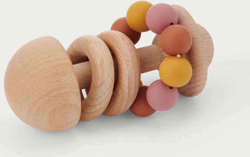 Grzechotka koralikowa SiliSoft Grzechotka koralikowa SiliSoft to wysokiej jakości, nowoczesna zabawka. Łączy drewniane elementy (drewno bukowe) i miękki, bezpieczny silikon spożywczy. Przeznaczona jest dla dzieci od pierwszych dni życia. To właśnie takie małe pociechy uczą się poznawać świat i eksplorować swoje otoczenie, a zabawki sensoryczne pomagają im w tym procesie! Połączenie gładkiego drewna i silikonowych koralików o wyczuwalnej fakturze to fantastyczny sposób na dostarczanie zorganizowanych i przemyślanych bodźców dotykowych. Delikatne dźwięki Grzechotki koralikowej SiliSoft pobudzają zmysł słuchu, zachęcając maluszka do chwytania i potrząsania. Takie aktywności wpływają nie tylko na wzmacnianie zmysłów i integrację sensoryczną, ale również wspierają rozwój zdolności motorycznych i koordynacji ręka-oko małego użytkownika. Kolorowe silikonowe koraliki można ponadto podgryzać, co złagodzi ból i dyskomfort podczas ząbkowania. Grzechotkę koralikową wykonano bowiem z certyfikowanego drewna oraz silikonu spożywczego spełniającego normy LFGB i FDA. Dzięki temu zabawka jest wolna od toksyn, łatwa do mycia i wyjątkowo trwała – posłuży dziecku przez długi czas . Grzechotka koralikowa SiliSoft jest idealnym rozwiązaniem dla rodziców poszukujących bezpiecznej i rozwijającej zabawki sensorycznej. Sprawdzi się u terapeutów i pedagogów wspierających rozwój motoryki małej i sensoryki u dzieci. [ikony-produktu-opisy] Co zawiera? Grzechotka koralikowa SiliSoft – 1 szt. Główne informacje Producent: TickiT Wiek: bez ograniczeń Materiał: silikon spożywczy, drewno bukowe Wymiary: dł. 10 cm x szer. 5 cm Zabawka posiada certyfikat CE. Pomysły na zabawę Dźwiękowy tik-tak – pobudzanie zmysłu słuchu, wzmacnianie zdolności motorycznych i koncentracji Pokaż dziecku, jak potrząsać grzechotką, aby usłyszeć uderzające o siebie i drewniany korpus koraliki. Gdy maluszek zapozna się z działaniem grzechotki, możesz zabawę urozmaicić: zatrzymaj rękę, gdy dziecko się skupia, gdy odwraca wzrok, rozprasza się – grzechocz na nowo. To ćwiczenie stymuluje percepcję słuchową i dziecięcą cierpliwość. Instrukcja