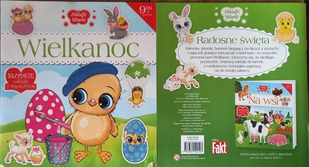 "Naklejki iskierki" to seria książeczek z naklejkami i krótkimi historyjkami dla najmłodszych dzieci. Ciekawe przygody bohaterów i brokatowe naklejki pomagają maluchom w rozwoju motoryki małej i spostrzegawczości (naklejkę należy dopasować do kształtu na odpowiedniej stronie). Bohaterami książeczek są kucyki, księżniczki, zwierzątka z zoo, jednorożce, słodkie kotki i psotne pieski, czyli postaci najbardziej lubiane przez dzieciaki Wielkanoc – Książka dla dzieci z naklejkami "Wielkanoc" to wspaniała książka dla najmłodszych, która wprowadza dzieci w magiczny świat świąt wielkanocnych. Dzięki kolorowym ilustracjom i interaktywnym naklejkom, mali czytelnicy będą mogli odkrywać tradycje i zwyczaje związane z tym radosnym okresem. Dla kogo jest ta książka? Dzieci w wieku przedszkolnym i wczesnoszkolnym Rodzice poszukujący edukacyjnych materiałów dla swoich pociech Nauczyciele i wychowawcy chcący wzbogacić zajęcia o tematykę wielkanocną Miłośnicy książek z naklejkami i interaktywnych publikacji Co zyskasz dzięki tej publikacji? Interaktywna nauka: Dzieci uczą się o tradycjach wielkanocnych poprzez zabawę z naklejkami. Rozwój kreatywności: Książka zachęca do twórczego myślenia i samodzielnego odkrywania. Wzmacnianie więzi rodzinnych: Wspólne czytanie i zabawa z naklejkami sprzyjają spędzaniu czasu z rodziną. Wprowadzenie do kultury: Dzieci poznają znaczenie i symbolikę świąt, co rozwija ich wiedzę o świecie. Kluczowe tematy i obszary Tradycje wielkanocne Symbolika jajek i zajączków Interaktywne zabawy z naklejkami Wzmacnianie umiejętności manualnych i poznawczych Radość z odkrywania i nauki O Wydawcy Ringier Axel Springer Polska – renomowane wydawnictwo, które specjalizuje się w publikacjach dla dzieci, oferując książki, które łączą edukację z zabawą. Producent/osoba odpowiedzialna za bezpieczeństwo produktuRingier Axel Springer Polska Sp. z o.o.Domaniewska 4902-672 Warszawagpsr@ringieraxelspringer.pl500 011 068