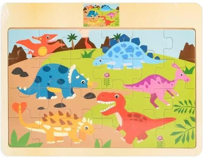 Układanka edukacyjna drewniana Daffi z motywem dinozaurów Prezentujemy doskonałą zabawkę edukacyjną dla maluchów, która zdobią przepiękne dinozaury! Ta drewniana układanka została stworzona z myślą o dzieciach, które mają już co najmniej 18 miesięcy. Autentyczne materiały, jakie wykorzystano do jej produkcji, sprawiają, że dzieci mogą się nią bawić w sposób bezpieczny, przynosząc jednocześnie wiele korzyści dla ich umiejętności motorycznych i poznawczych. Ponadto, układanka posiada certyfikat CE, co potwierdza jej wysoką jakość i zgodność z normami. Zestaw składa się z 24 kolorowych elementów, które można ułożyć w pełnoprawny, poglądowy obrazek z sympatycznymi dinozaurami. Proces ten pozwala rozwinąć wyobraźnię, spostrzegawczość, a także koordynację wzrokowo-ruchową dzieci, które z zapałem poszukują kolejnych części puzzli. Dzięki łatwej w obsłudze konstrukcji, maleństwa mają szansę poznawać świat dinozaurów na wiele różnych sposobów, jednocześnie poszerzając swój zasób słownictwa i ucząc się nazywać poszczególne gatunki. Drewniana układanka dino Daffi to nie tylko bardzo efektywna, ale również przyjazna dla środowiska zabawka, dzięki wykorzystaniu materiałów naturalnych. Jest to więc doskonały wybór dla rodziców, którzy chcą łączyć naukę i zabawę, dbając jednocześnie o ekologię. EAN: 5905422041127
