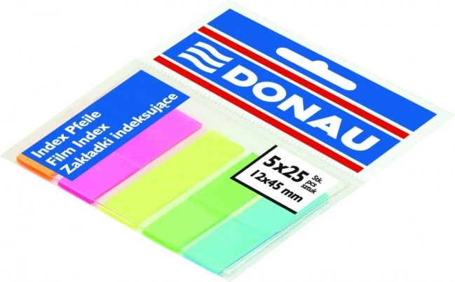 ZAKŁADKI INDEKSUJĄCE DONAU, PP, 12X45MM, 5X25 KART., MIX KOLORÓW zakładki indeksujące, idealne do pozostawienia uwag, informacji w formie zakładki ilość zakładek: 5x25 w rozmiarze 12x45mm wykonane z folii PP o grubości 60μm wielorazowe z możliwością zapisu nowe, żywe, fluorescencyjne kolory …