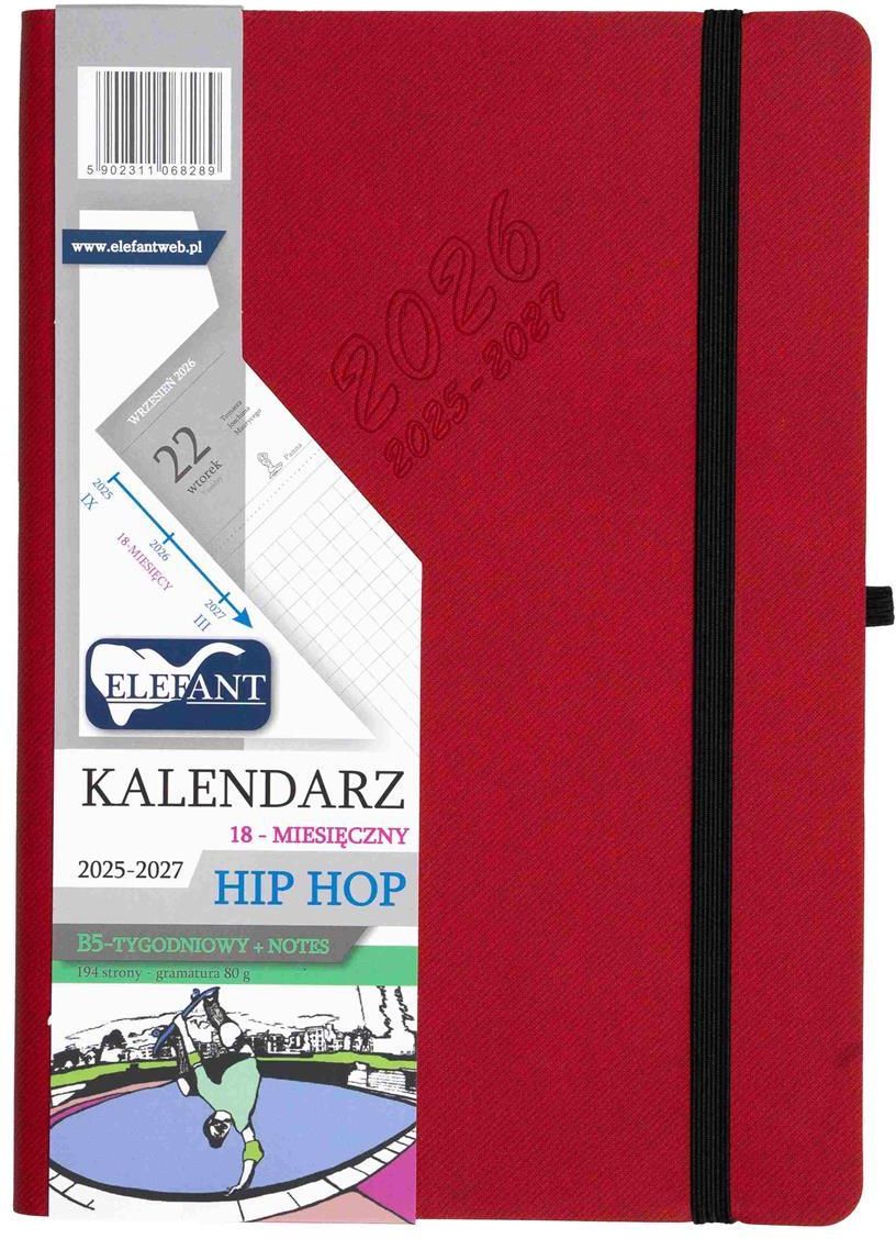 Kalendarz 2026 B5 18 miesięcy Hip hop, czerwony Ten kalendarz wykonano z trwałych materiałów. Tydzień znajduje się na stronie z lewej strony, a z prawej notes w kratkę.Szczegóły:• zamykany na gumkę w kolorze dostosowanym do każdego koloru osobno,• specjalne nity ozdobne do przymocowania gumki w oprawie,• gumka na długopis w kolorze dostosowanym do każdego koloru osobno,• zaokrąglone narożniki opraw i stron, • brzegi kalendarza z kolekcji Hip Hop są w kolorze kremowym lub w kolorze gumki zamykającej,• tasiemka w kolorze gumki zamykającej,• pierwsze strony wewnątrz wraz z kopertą na tylnej oprawie w kolorze oprawy lub kremowym lub w kolorze gumki zamykającej,• czytelny układ kalendarza Hip Hop: tydzień na stronie w układzie z lewej strony kalendarz tydzień na jednej stronie, a z prawej notes w kratkę ,• kalendarium od 15 września 2025 do 28 marca 2027,• wewnątrz: plan roku i rozkład roku 2025, terminy ferii zimowych, święta oficjalne i zwyczajowe, podróże, protokół powypadkowy w przypadku stłuczki, notes, skorowidz teleadresowy, kalendarium dodatkowe na 2024-2025-2026 rok. Ten kalendarz wykonano z trwałych materiałów. Tydzień znajduje się na stronie z lewej strony, a z prawej notes w kratkę.Szczegóły:• zamykany na gumkę w kolorze dostosowanym do każdego koloru osobno,• specjalne nity ozdobne do przymocowania gumki w oprawie,• gumka na długopis w kolorze dostosowanym do każdego koloru osobno,• zaokrąglone narożniki opraw i stron, • brzegi kalendarza z kolekcji Hip Hop są w kolorze kremowym lub w kolorze gumki zamykającej,• tasiemka w kolorze gumki zamykającej,• pierwsze strony wewnątrz wraz z kopertą na tylnej oprawie w kolorze oprawy lub kremowym lub w kolorze gumki zamykającej,• czytelny układ kalendarza Hip Hop: tydzień na stronie w układzie z lewej strony kalendarz tydzień na jednej stronie, a z prawej notes w kratkę ,• kalendarium od 15 września 2025 do 28 marca 2027,• wewnątrz: plan roku i rozkład roku 2025, terminy ferii zimowych, święta oficjalne i zwyczajowe, podróże, protokół powypadkowy w przypadku stłuczki, notes, skorowidz teleadresowy, kalendarium dodatkowe na 2024-2025-2026 rok.