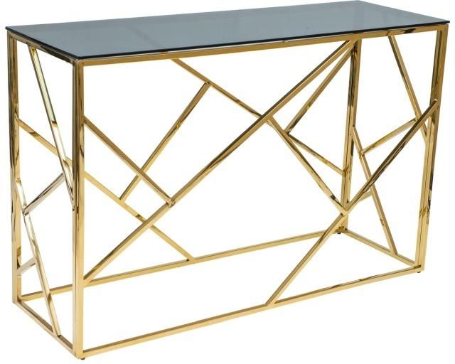 Konsola Escada C szkło/złoty Wykonana w nowoczesnym stylu konsola Escada C to idealny mebel do salonu, pokoju dziennego i przedpokoju. Sprawdzi się jako dodatkowe miejsce do postawienia ulubionych dekoracji, kwiatów czy oświetlenia. Szeroki blat wykonany z dymionego szkła hartowanego zapewni …