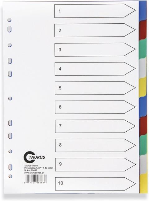 PRZEKŁADKI TAURUS DO SEGREGATORA PP A4 1-10 KOLOR wykonane z ekologicznego polipropylenu o grubości 120µm ilość przekładek: 10+1 pierwsza karta opisowa z numerami w kolorze białym dziurkowanie: 11 format: A4 rozmiar przekładki: 225x297mm każdy komplet osobno pakowany w folię mix kolorów