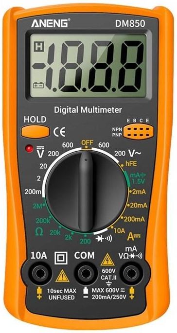 MIERNIK PRĄDU CYFROWY MULTIMETR TEST NAPIĘCIA LCD PAGMIL MIERNIK PRĄDU CYFROWY MULTIMETR TEST NAPIĘCIA LCD BATERIA W ZESTAWIE! Miernik uniwersalny ANENG DM850 to poręczny i uniwersalny multimetr idealny do warsztatu, serwisu czy samochodu. Umożliwia pomiar wysokich zakresów prądu i napięcia AC/DC, a także pomiar małych prądów DC. Miernikiem przetestujemy diody prostownicze i LED, tranzystory NPN i PNP, a także ciągłość obwodu. Dzięki niemu zmierzymy wartość rezystancji, napięcia przewodzenia diod, ciągłość obwodu czy też hFE tranzystorów bipolarnych. Funkcje Kontrola ciągłości obwodu, sygnalizacja dźwiękiem i diodą LED pomiar rezystancji zakres od 200 Ohm do 2M Ohm +/- 2,5% pomiar napięcia przewodzenia diod pomiar natężenia DC zakres 2 - 200mA / 10A +/- 2,5% pomiar napięcia DC 200mV - 600V i AC 200 - 600V +/- 2% pomiar tranzystorów zapamiętanie wyniku - przycisk HOLD Dane techniczne - DCV 200m/2/20/200[V] +/-(2%+/- 2) 600V +/-(2,5%+/- 2) - ACV 200V +/-(2%+3) 600V +/-(2%+3) - DCA 2mA/20mA +/-(2% +/-2) 200mA +/-(2,5% +/-2) 10A +/- (2,5% +/-2) - OHM 200 - 2M Ohm +/- 2.5% Test tranzystorów: tak Automatyczny wyłącznik: nie Test diod: tak Sygnalizacja ciągłości obwodu: tak buzzer + LED Wyświetlacz LCD: tak Funkcja HOLD - zapis pomiaru Bateria: 9V 6F22 NIE ZAWARTA W ZESTAWIE Zakres wyświetlacza: 1-999 Zawarte w zestawie Miernik uniwersalny ANENG DM850 - 1 szt. Komplet przewodów pomiarowych Oryginalne opakowanie Instrukcja obsługi Stan: Nowy EAN (GTIN): 5905884523346 Kod producenta: DM850 Marka: PAGMIL Model: DM850 Typ: ręczny Rodzaj wyświetlacza: LCD Pomiar: napięcie przemienne AC|napięcie stałe DC|prąd przemienny AC|prąd stały DC Stan opakowania: oryginalne