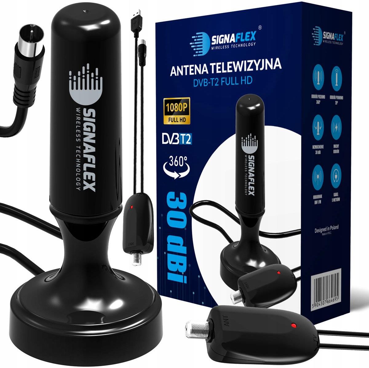 AKTYWNA ANTENA 30dBi SIGNAFLEX® DO TV NAZIEMNEJ ZE WZMACNIACZEM ZYSK ENERGETYCZNY 30dBi Przystosowana do obioru najnowszego kodowania H.265 DVB-T2 ANTENA POKOJOWA DO UŻYTKU WEWNĘTRZNEGO ODBIÓR 360° DVB-T / DVB-T2 WSZYSTKIE KANAŁY TV ORAZ RADIO (UVH + VHF) FILTR LTE ELIMINUJĄCY ZAKŁÓCENIA 5 METROWY KABEL MAGNETYCZNA PODSTAWKA Specyfikacja techniczna Częstotliwość: 470-862MHz Zysk energetyczny: 30dBi Długość kabla: 5m Impedancja: 75Ω Materiał: plastik Kolor: czarny Dlaczego warto wybrać ten produkt? Renomowana marka SIGNAFLEX® MUX1, MUX2, MUX3, MUX8 Duży zasięg odbioru sygnału Filtr LTE Łatwa instalacja Magnetyczna podstawa Niewielki rozmiar Trwały materiał ŁATWA INSTALACJA Podłącz przewód antenowy do telewizora lub tunera TV Ciesz się wysokiej jakości telewizją cyfrową! Cyfrowa antena telewizyjna HDTV - daleki zasięg Chcesz w każdej chwili cieszyć się nieskazitelnym obrazem, kiedy oglądasz swój ulubiony program w telewizji? Cyfrowa antena telewizyjna HDTV sprawi, że Twoje domowe seanse zawsze będą przebiegać bez zakłóceń. Pomocnik w życiu codziennym Cyfrowa antena telewizyjna DVB-T służy do odbioru sygnału telewizji naziemnej. Dzięki niej możesz oglądać wiele kanałów telewizyjnych bez konieczności korzystania z zewnętrznych dostawców telewizji kablowej. Antena cyfrowa wzmacnia zasięg odbieranego sygnału. Twój odpoczynek przed telewizorem już nie zostanie więcej przerwany przez niesprzyjające warunki pogodowe, które mogą mieć negatywny wpływ na jakość obrazu. Urządzenie spełnia swoje zadanie w domach i mieszkaniach, ale możesz je także zabrać w podróż i korzystać np. na campingu czy w samochodzie. Technologiczny majstersztyk Antena telewizyjna odbiera sygnał z dużej odległości. Dzięki niej, jeśli tylko możliwości Twojego telewizora na to pozwalają, możesz oglądać programy w jakości 4K ultraHD. Cyfrowa antena posiada w zestawie wysokiej jakości kabel miedziany, który zapewnia stabilność transmisji sygnału. Szybka i bezproblemowa instalacja Antena telewizyjna została wyposażona w podstawkę z magnesem, dzięki czemu bardzo łatwo zainstalujesz ją w dogodnym miejscu - np. na stojaku do telewizora czy na ścianie. Urządzenie nie wymaga dodatkowego źródła zasilania - podłączasz je do odbiornika telewizyjnego i to wszystko!