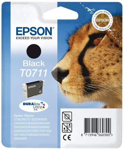 Atrament T0711 Gepard DURABrite Ultra, pojedyncze opakowanie, czarny Atrament DURABrite Ultra zapewnia wysoką jakość dokumentów biznesowych oraz zdjęć o jakości jak ze studia fotograficznego, które są odporne na działanie wody, powstawanie smug i blaknięcie. Oszczędzaj dzięki oddzielnym wkładom atramentowym Pojedyncze wkłady Epson zapewniają większe oszczędności, ponieważ pozwalają wymienić tylko zużyty kolor. Atramenty Epson są zoptymalizowane do współpracy z drukarkami Epson Atramenty i papier firmy Epson zostały opracowane tak, aby w użyciu z drukarkami Epson dawać za każdym razem najlepsze rezultaty. Trwałość: Nasz tusz pigmentowy DURABrite Ultra pozwala tworzyć wyraźne, trwałe i wytrzymałe dokumenty, które są odporne na działanie wody, rozmazywanie i zakreślacze. POZOSTAŁE KOLORY Z TEJ SERII: