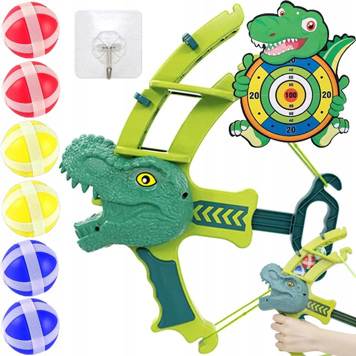 Zabawka łuk na kulki z tarczą DINO Heckermann Organizujesz przyjęcie urodzinowe dla swojego dziecka i chcesz zapewnić świetną zabawę grupową? Zestaw do strzelania kulkami z łuku to pomysł na fantastyczną rozrywkę zarówno dla małych, jak i dużych! Zalety produktu wspiera koordynację ruchową wzmacnia celność łatwy montaż wysokiej jakości materiały bezpieczna gra zręcznościowa uczy zdrowej rywalizacji rozrywka dla całej rodziny pomysł na prezent Trafiaj w środek tarczy Zestaw do strzelania kulkami z łuku to gwarancja wspaniałej rozrywki dla Twojego dziecka w gronie rodziny lub przyjaciół. Zabawa polega na tym, aby wprowadzać przyczepne kulki do łuku, naciągać go i strzelać nimi do tarczy. Ta gra zręcznościowa nie stwarza zagrożenia - jest przeznaczona dla dzieci od 3 roku życia. Ta gra rozwija u pociechy koordynację ruchową, zręczność i celność, a do tego zapewnia świetne spędzanie czasu i zacieśnianie więzi z bliskimi. Zestaw do strzelania kulkami z łuku uczy zdrowej rywalizacji i służy do nauki poprzez zabawę. Specyfikacja techniczna Materiał: plastik Kolor: zielony Wymiary łuku: 34 x 24 x 10 cm Liczba piłek: 6 Świetna zabawa gwarantowana Zestaw do strzelania kulkami z łuku może być wykorzystywany zarówno w domu, jak i w ogrodzie czy na wakacyjnym wyjeździe. Tarcza w kształcie sympatycznego dinozaura jest prosta w montażu - za pomocą haczyka zawiesisz ją w dogodnym miejscu. Wszystkie elementy gry zręcznościowej zostały wykonane z trwałych i bezpiecznych materiałów. W zestawie znajdziesz 6 kolorowych piłeczek, haczyk, tarczę i łuk.