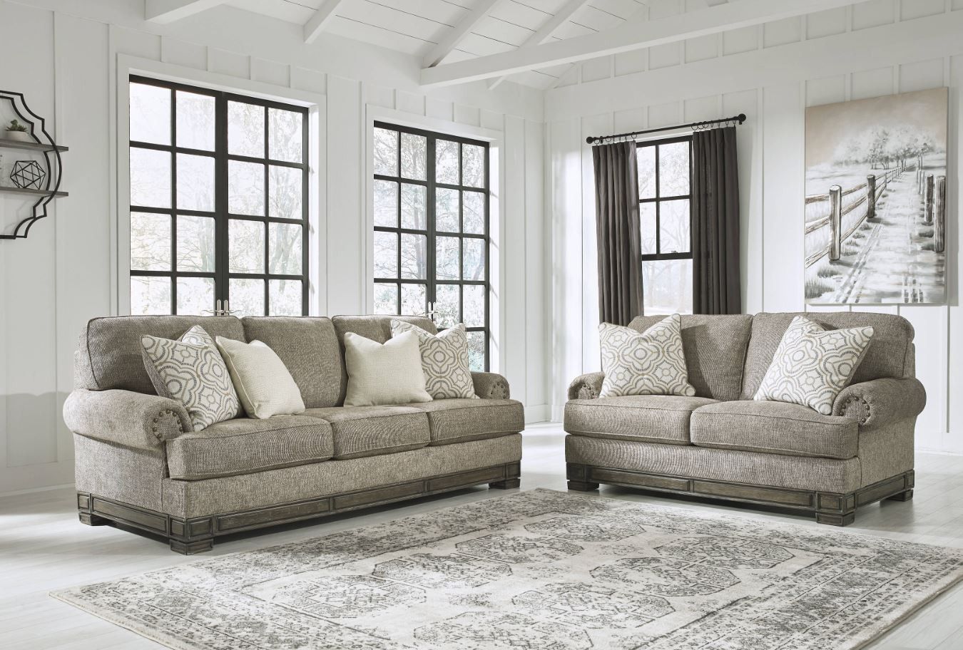 Komplet wypoczynkowy FLO to doskonały przykład ponadczasowego stylu inspirowanego klasycznym wzornictwem amerykańskim. Stylowe przeszycia, zaokrąglone podłokietniki i dekoracyjne pinezki nawiązują do estetyki angielskich mebli typu chesterfield, nadając całości elegancki i ciepły wygląd. Obie sofy wyróżnia solidna konstrukcja, komfortowe siedziska i efektowne, rzeźbione podstawy w ciemnym drewnie. Ciepła szara tapicerka stanowi neutralną bazę dla różnych aranżacji – od rustykalnych po nowoczesne, a wzorzyste poduszki dekoracyjne dodają całości stylowego wykończenia. W skład kompletu wchodzą:• Sofa 3-osobowa• Sofa 2-osobowa Najważniejsze cechy:• Inspirowane klasyką stylu amerykańskiego i chesterfield• Zaokrąglone podłokietniki z dekoracyjnymi nitami• Elegancka, neutralna tapicerka w odcieniu szarości• Stabilna drewniana rama z ozdobnym wykończeniem• W zestawie poduszki dekoracyjne w geometryczny wzór• Idealne do salonów w stylu klasycznym, rustykalnym i transitional Wymiary:Sofa 2-osobowa:• długość: 185 cm• głębokość: 102 cm• wysokość: 102 cm Sofa 3-osobowa:• długość: 251 cm• głębokość: 102 cm• wysokość: 102 cm Komplet FLO to nie tylko wygoda codziennego wypoczynku, ale też wyjątkowy styl, który wprowadza do wnętrza ciepło i klasę.